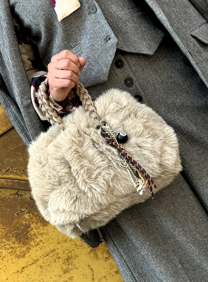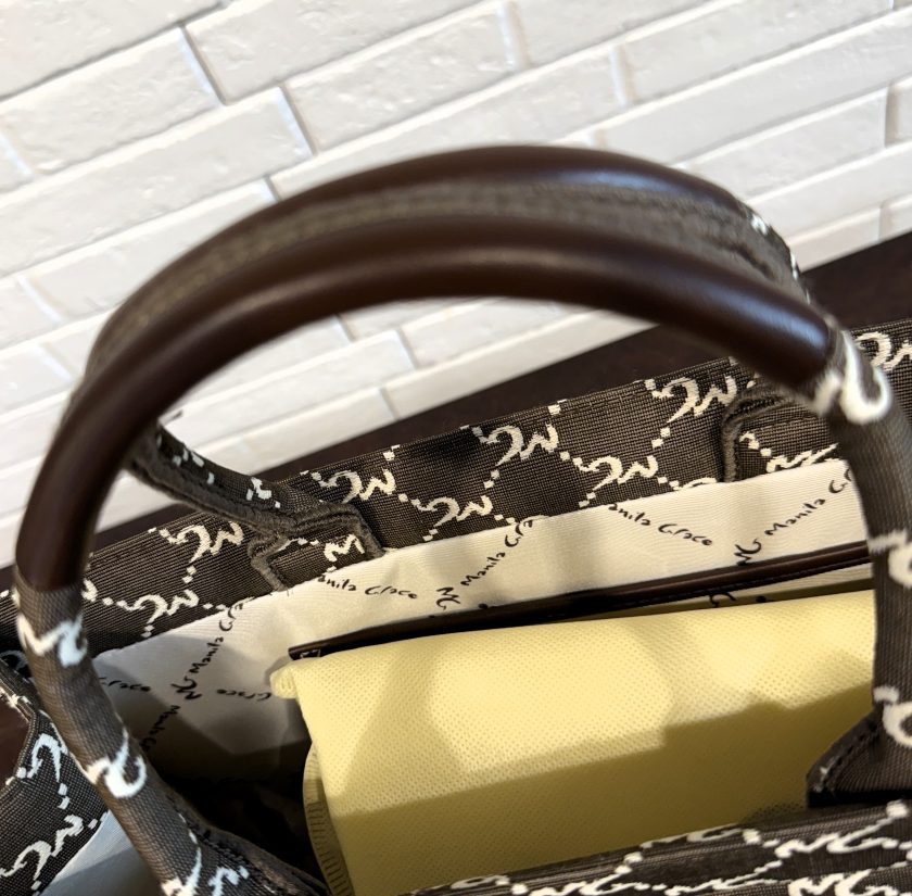 Tote bag in lavorazione jacquard a disegnatura logo all over. Dettagli in effetto pelle color cuoio. Misure : 37x29x13 Materiale : 100 % Pl . Colore : Terra.