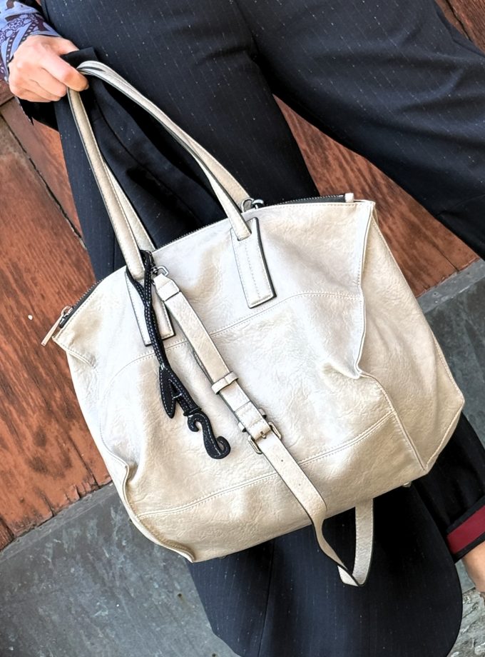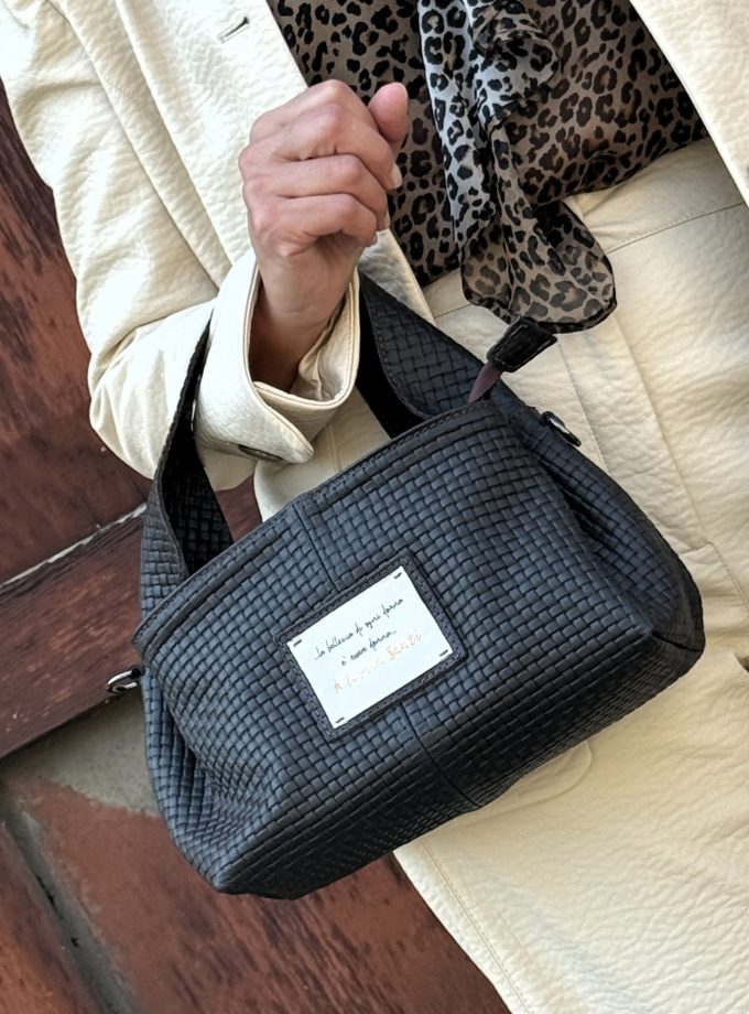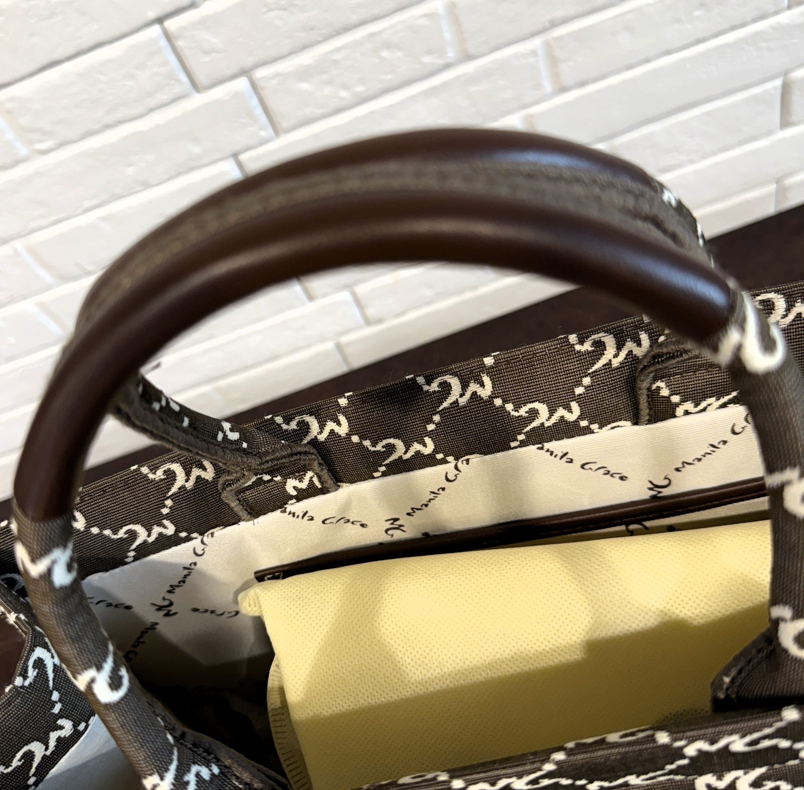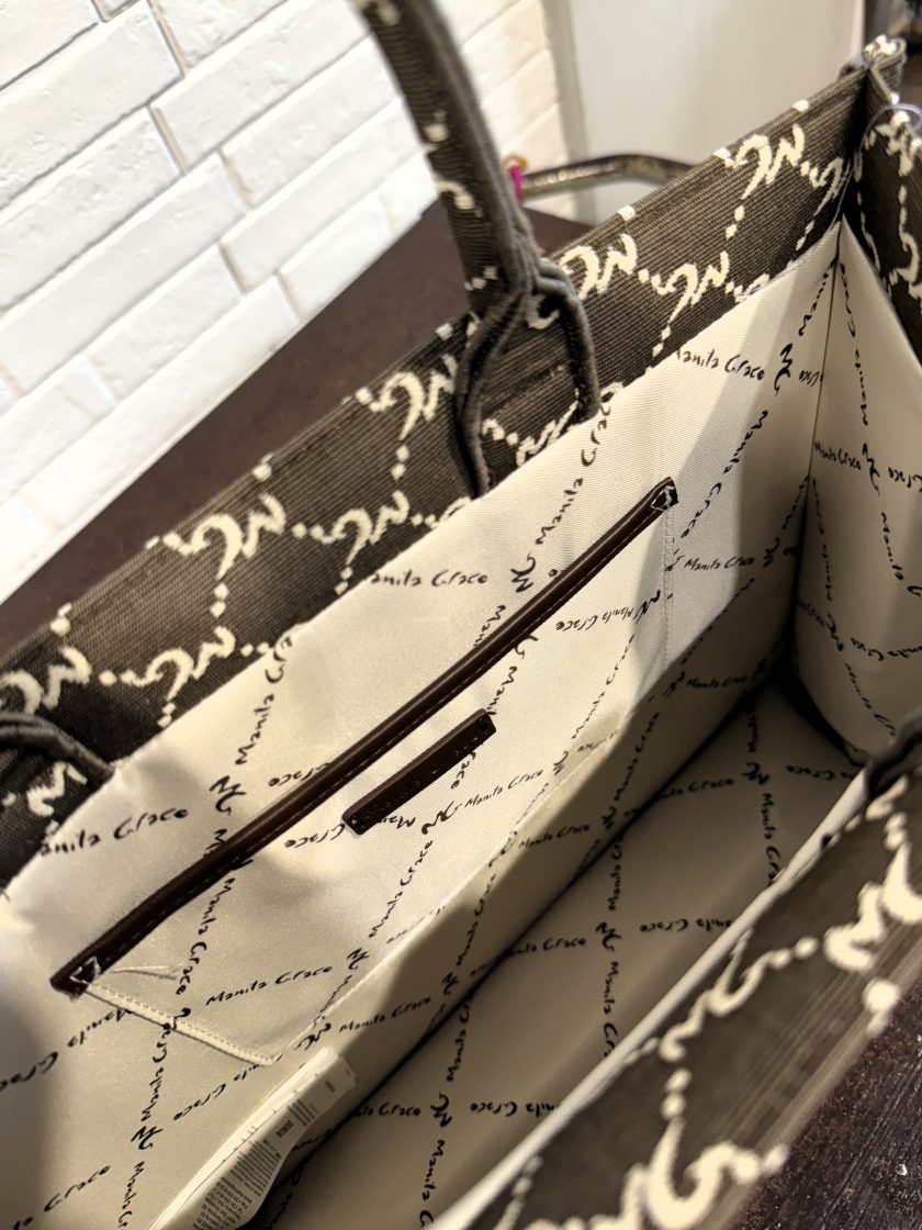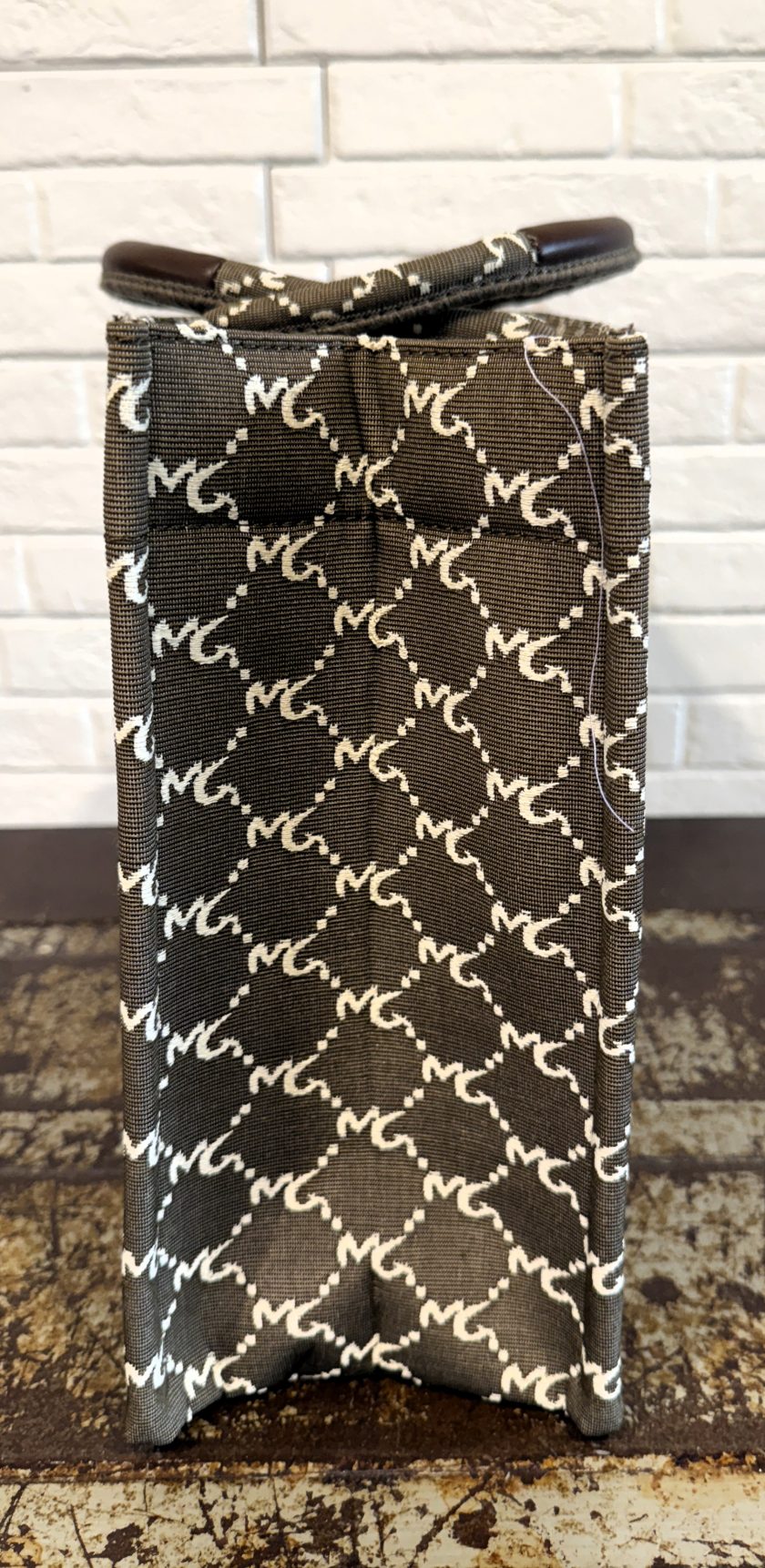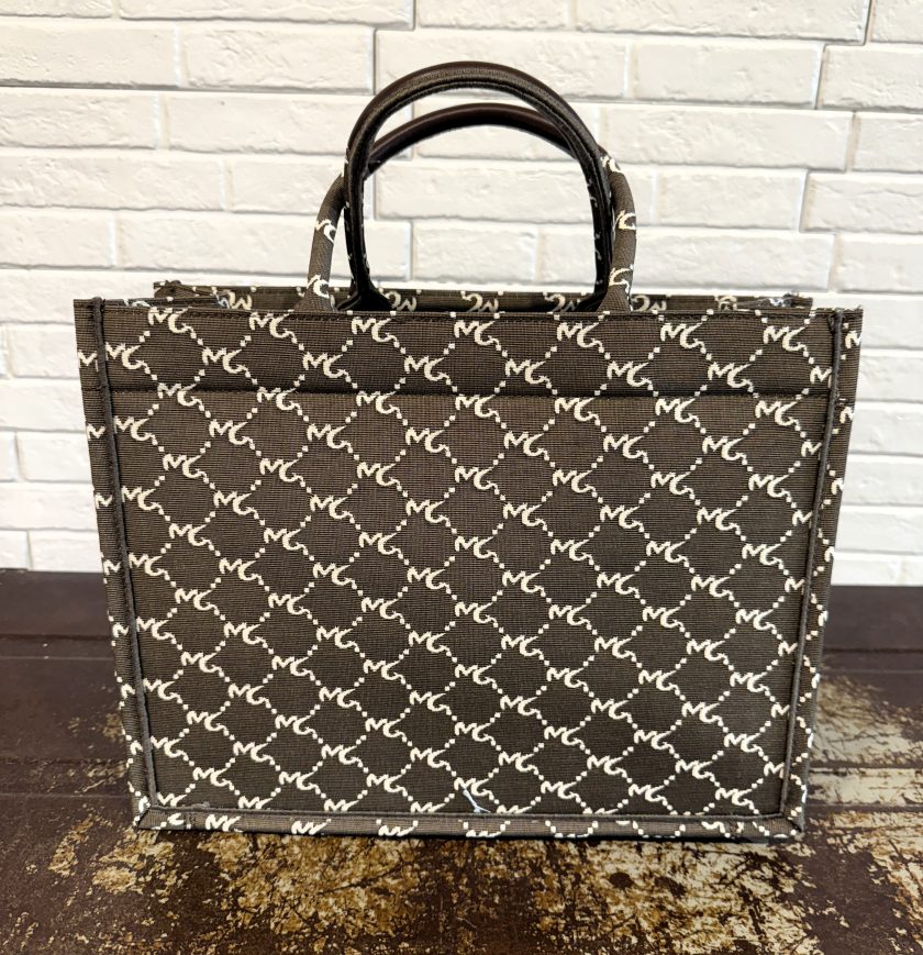 Tote bag in lavorazione jacquard a disegnatura logo all over. Dettagli in effetto pelle color cuoio. Misure : 37x29x13