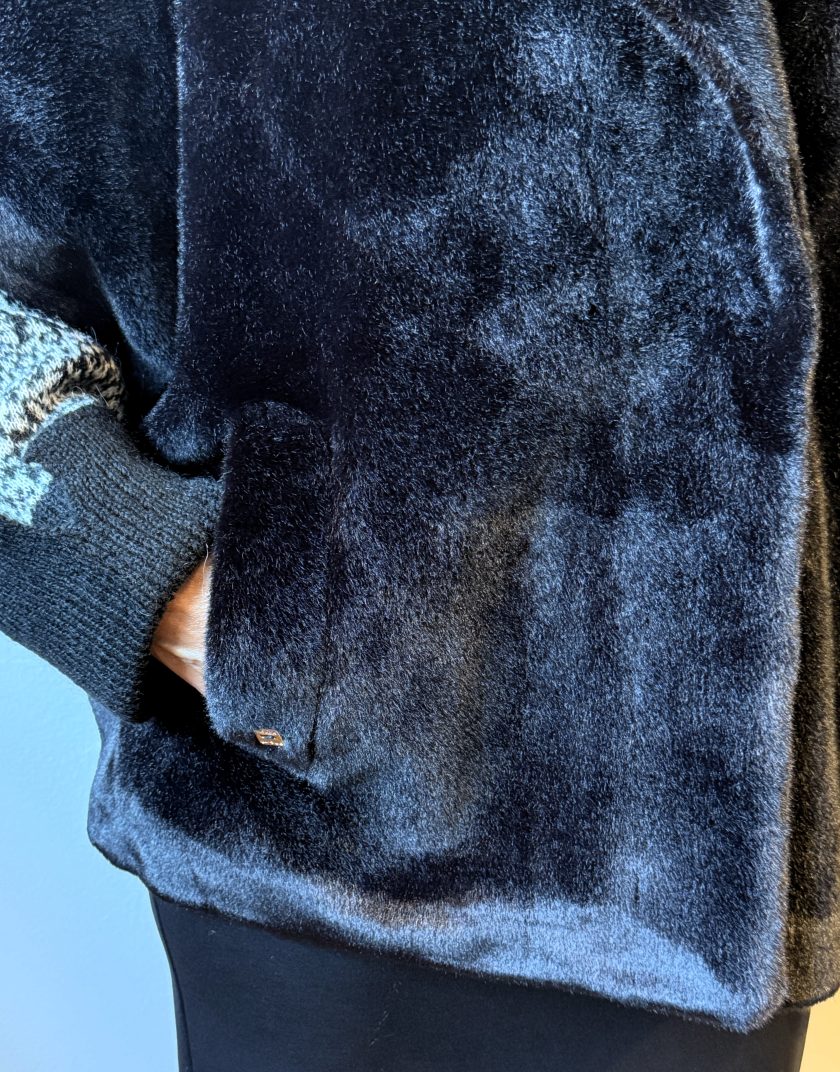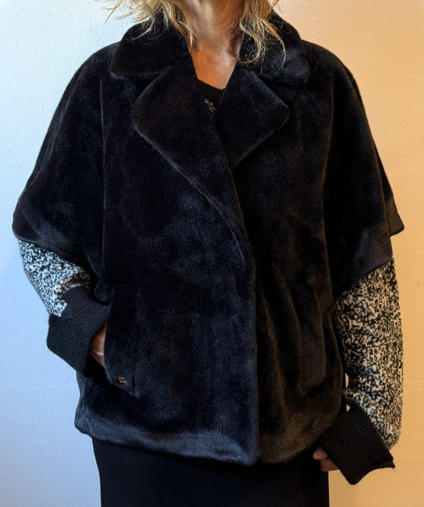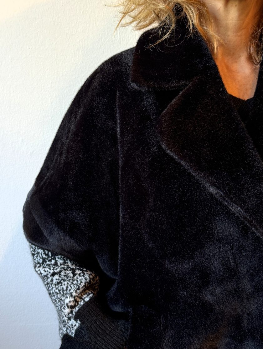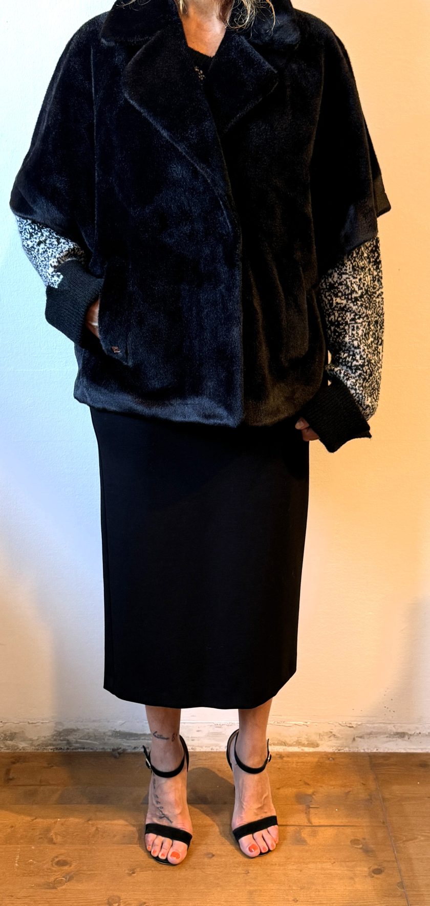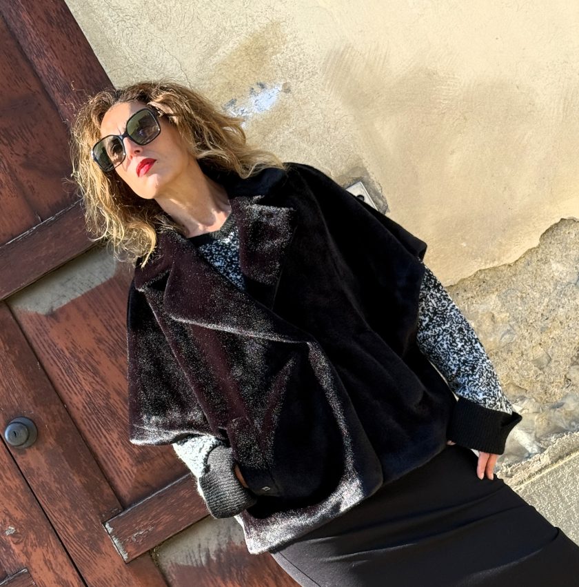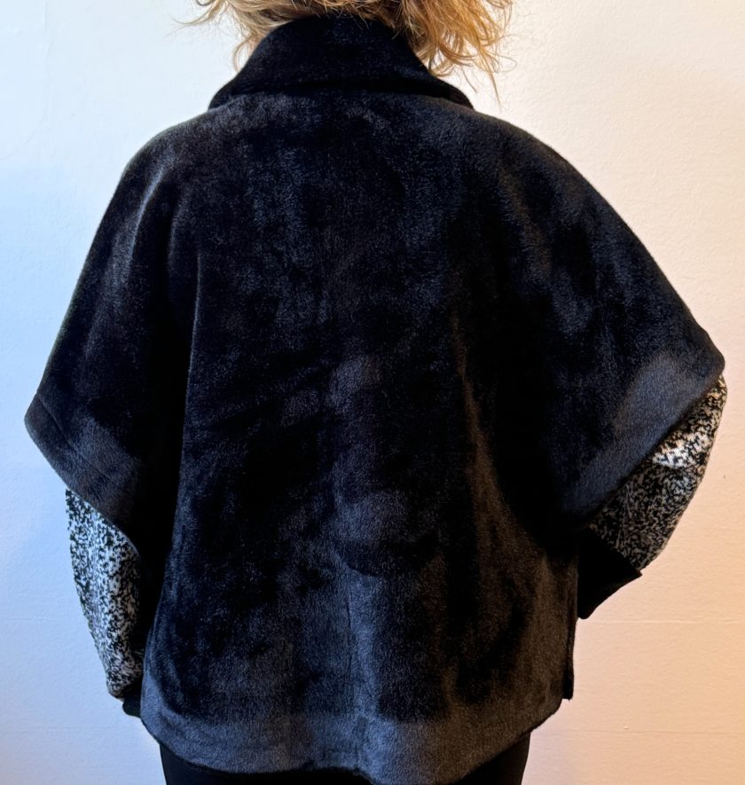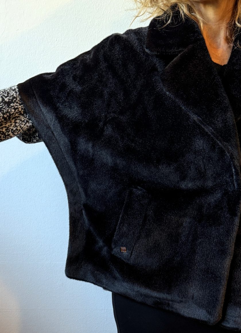 Morbido, essenziale, elegantissimo. Questa cappa corta in eco-pelliccia nera è il capospalla ideale per completare con classe ogni look invernale. Il taglio relaxed con manica ampia dona un tocco moderno, mentre il design minimal lo rende un passe-partout di stagione, facile da abbinare sia con look daywear che serali.