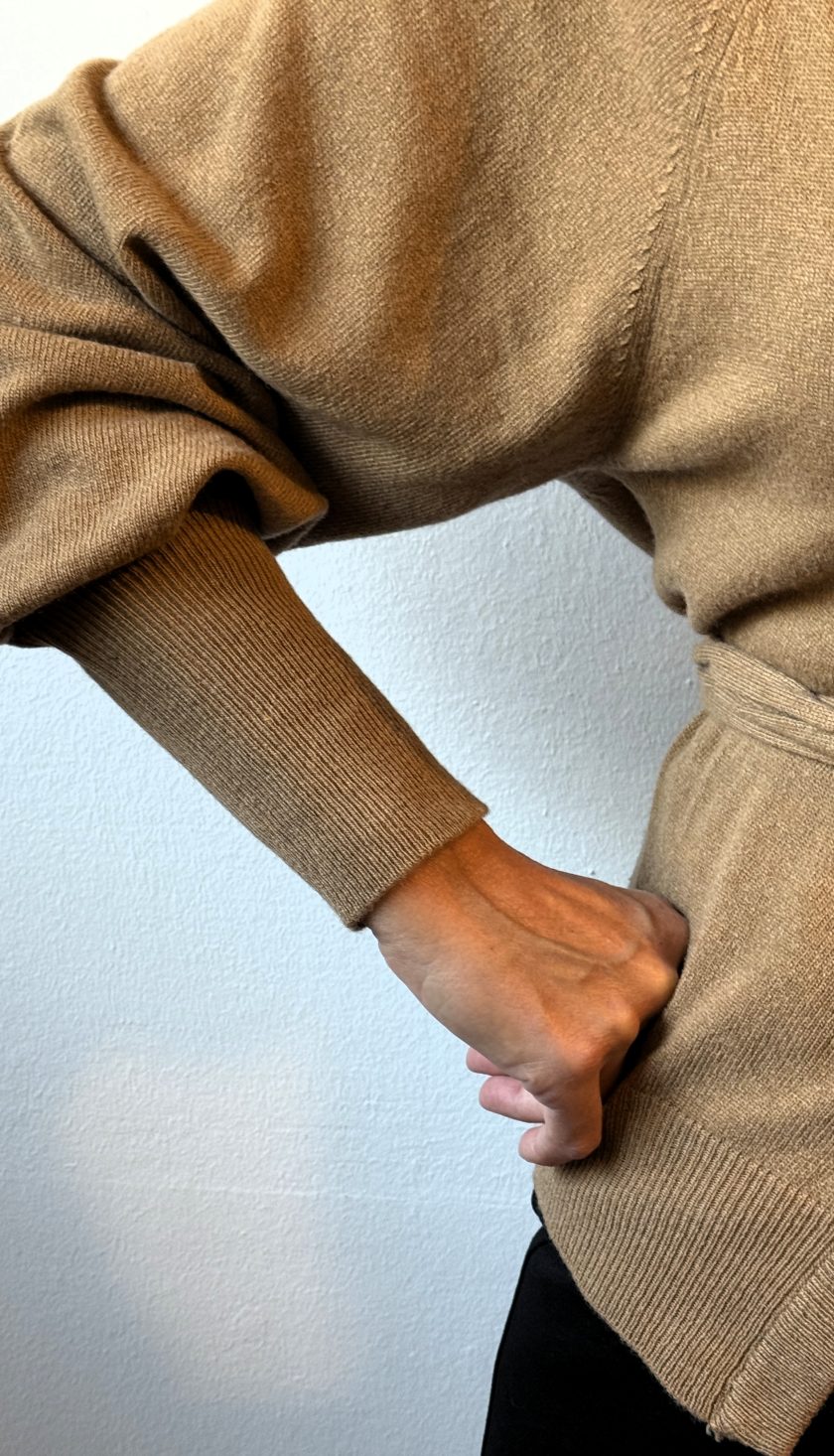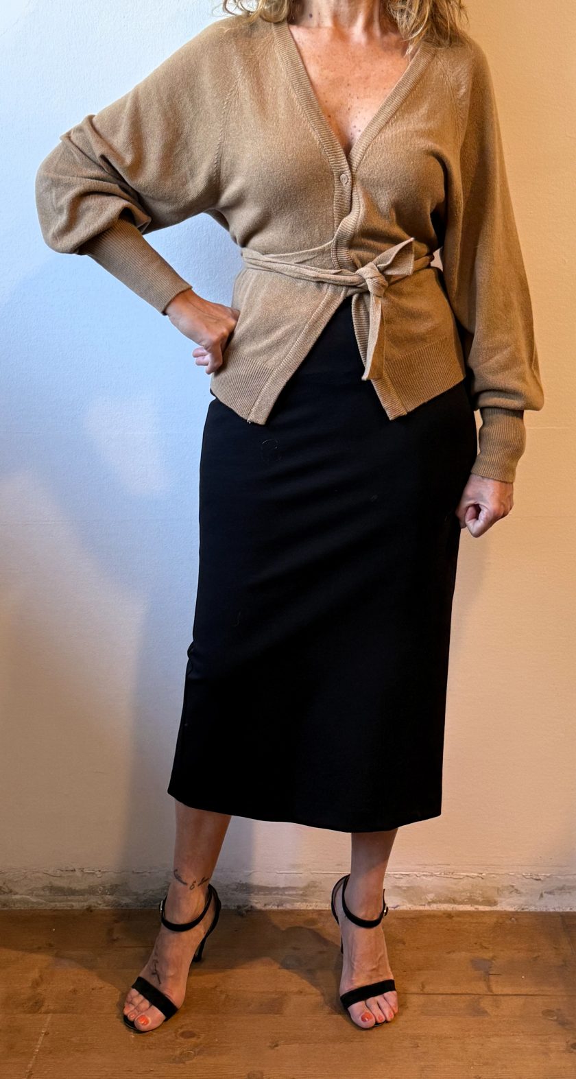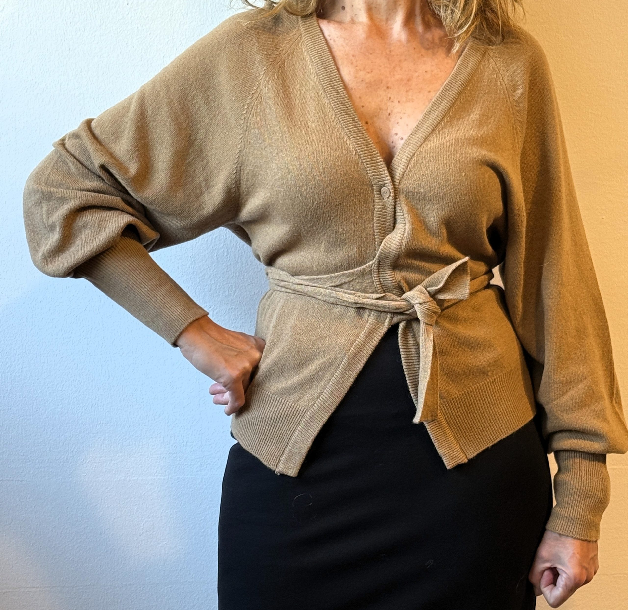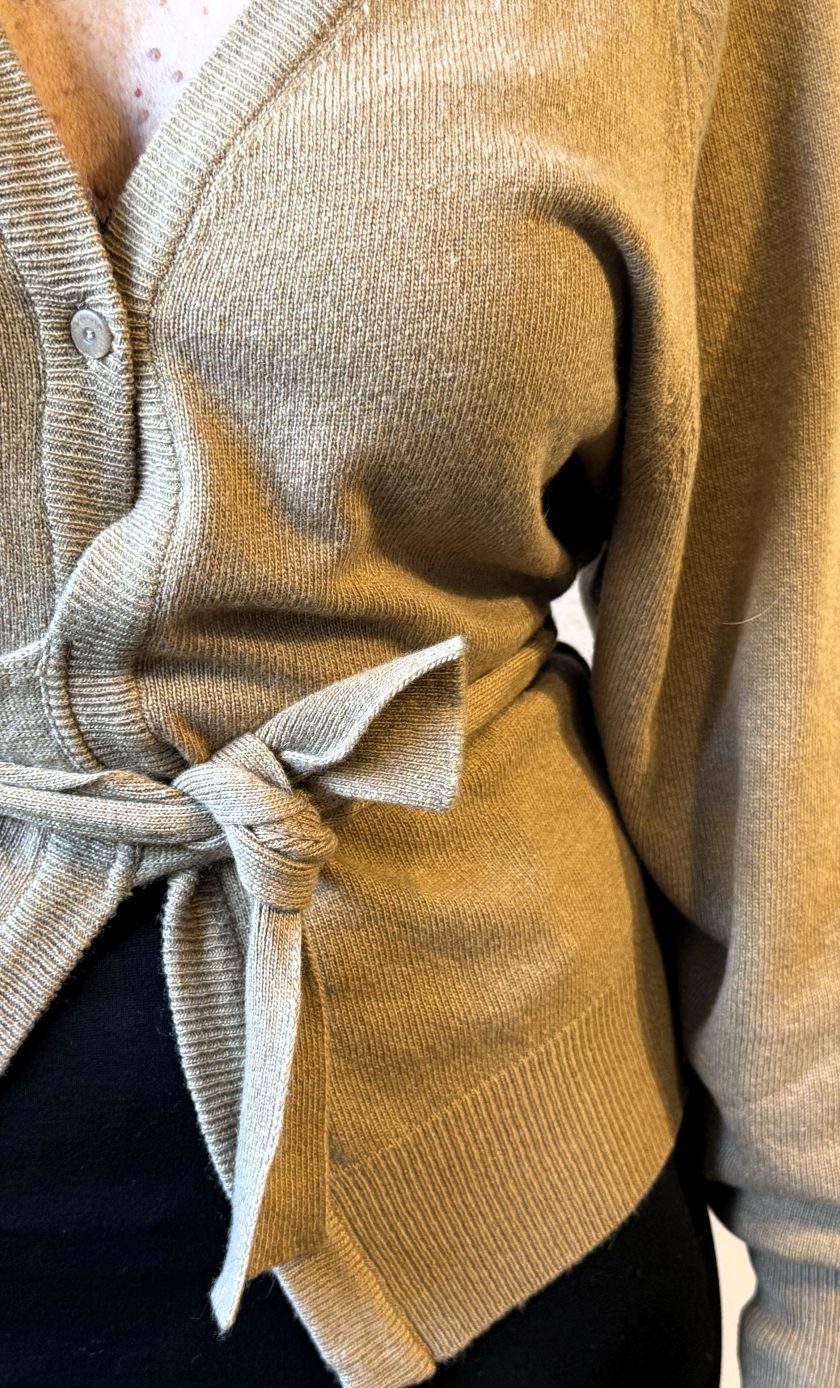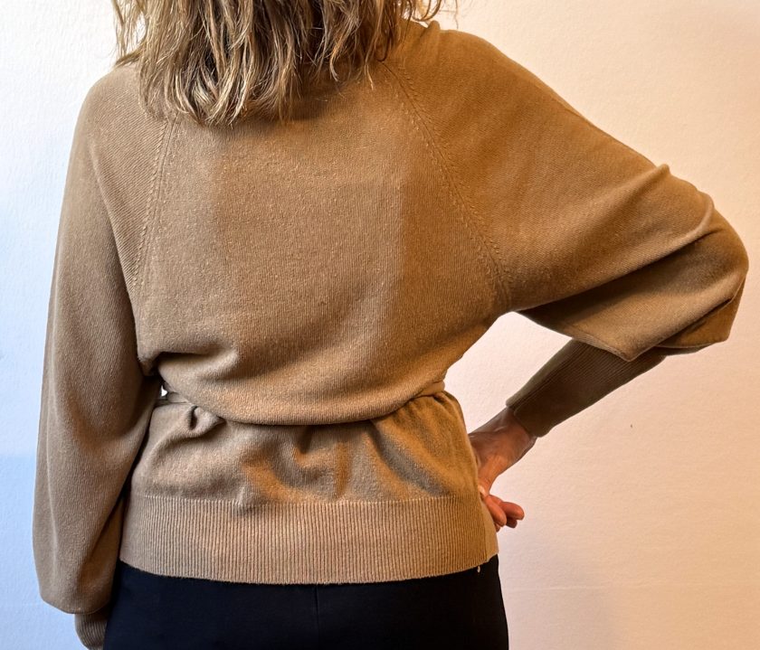 Cardigan incrociato realizzato in misto lana e cashmere, lavorato a maglia rasata con rifiniture a costina. Vestibilità morbida, ha un’importante scollatura a V molto femminile che può essere chiusa dal piccolo bottoncino, le maniche ampie con calature a raglan, polsini a costina. Il fit può essere reso più sofisticato allacciandolo in vita incrociando la cintura passandola nell’apposita maxi asola.