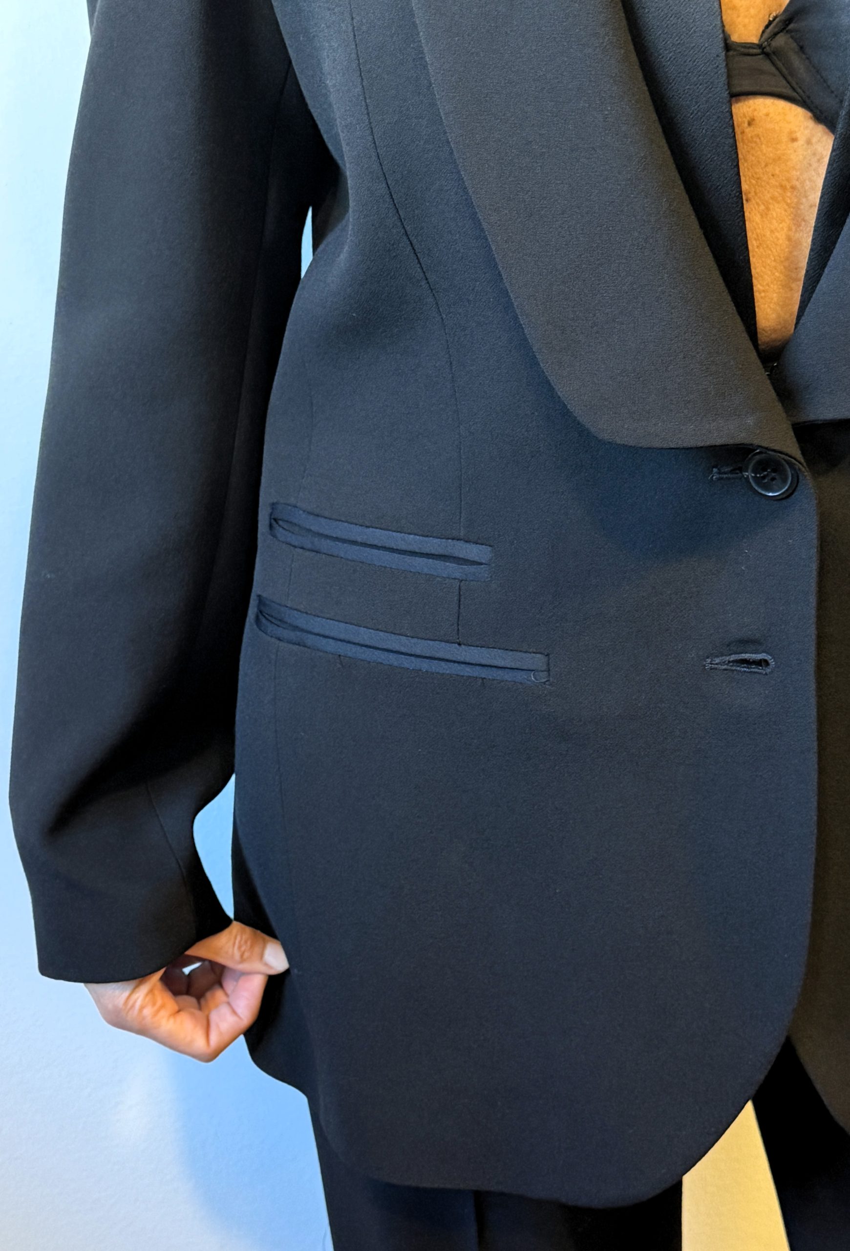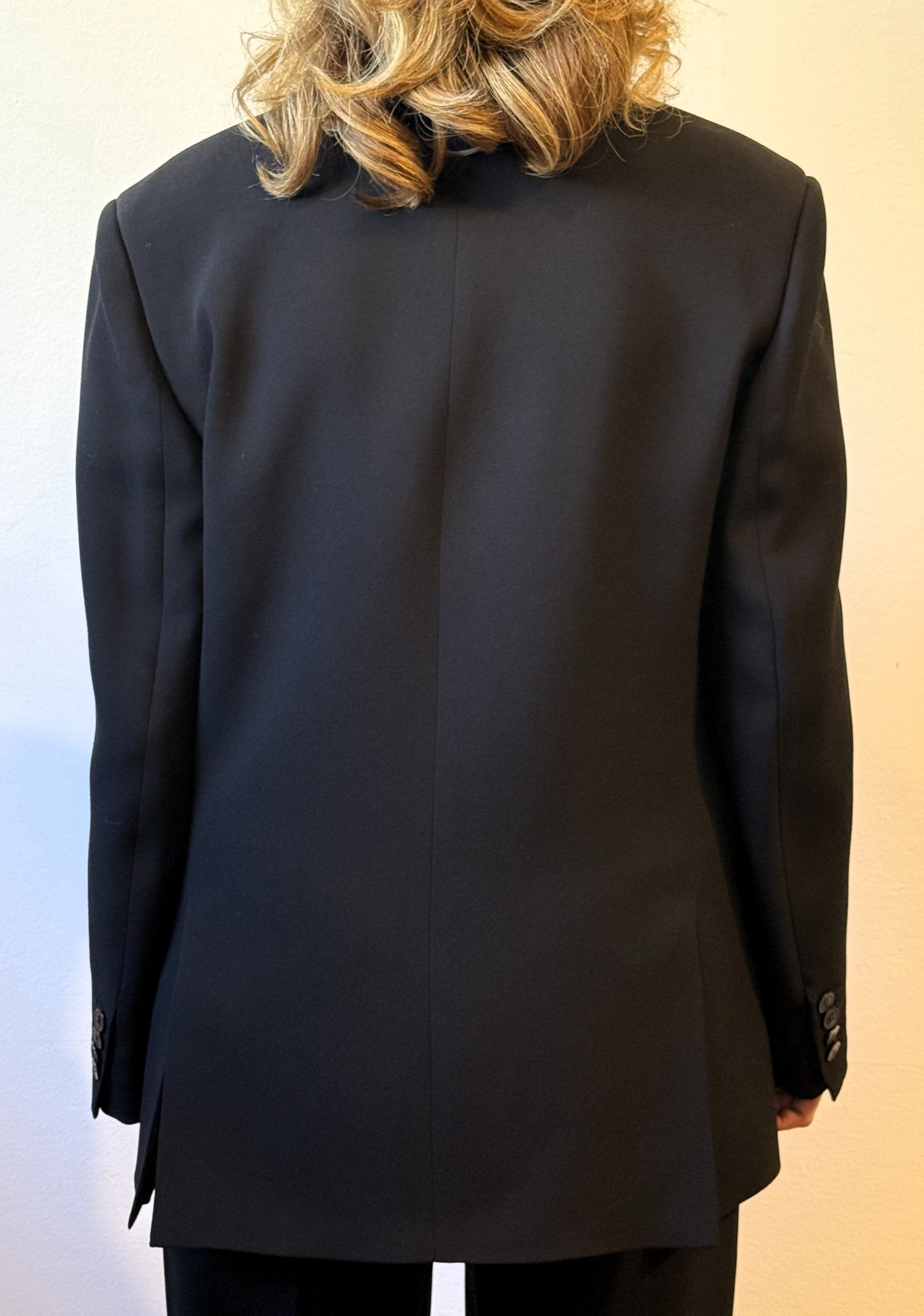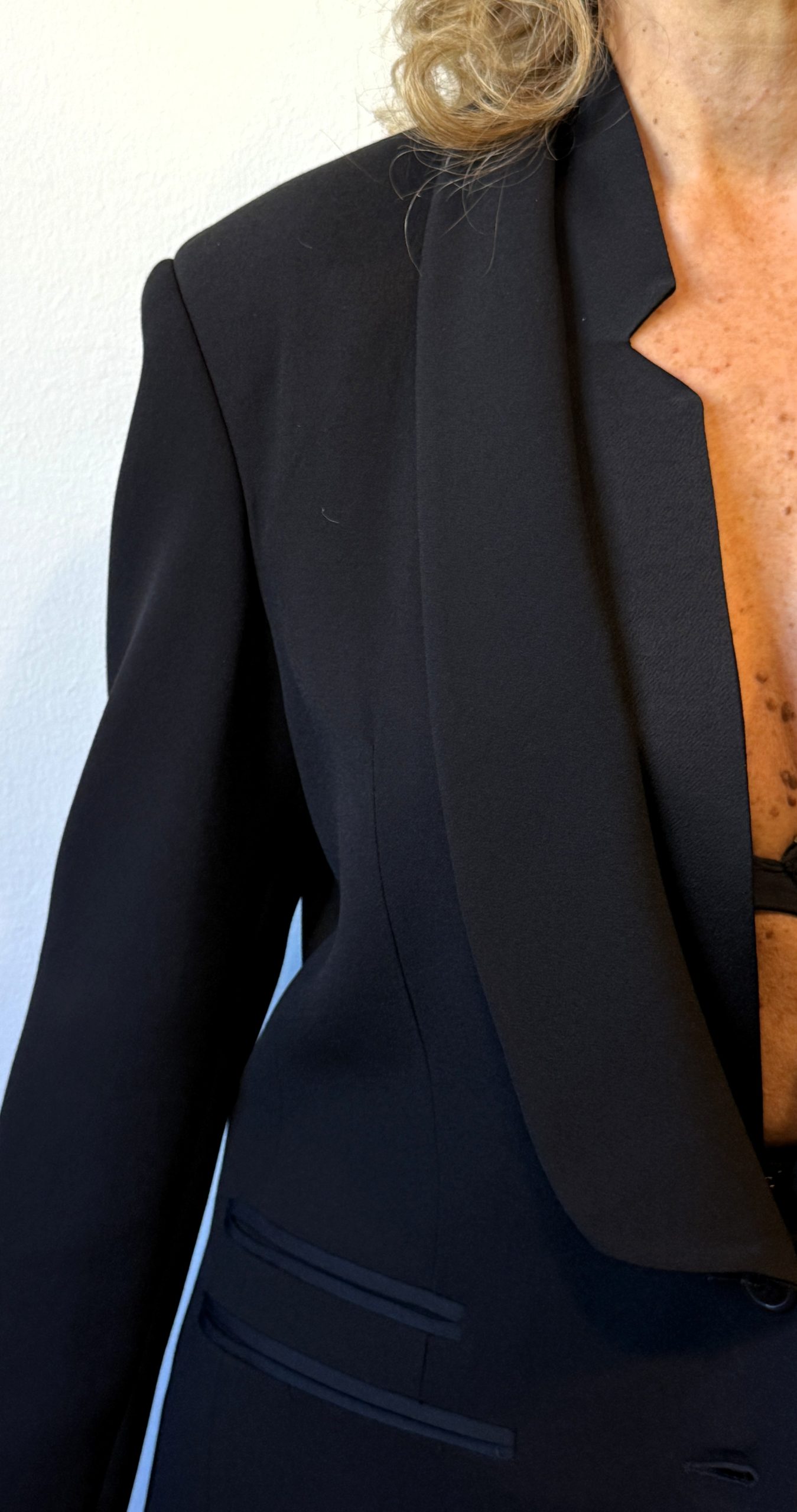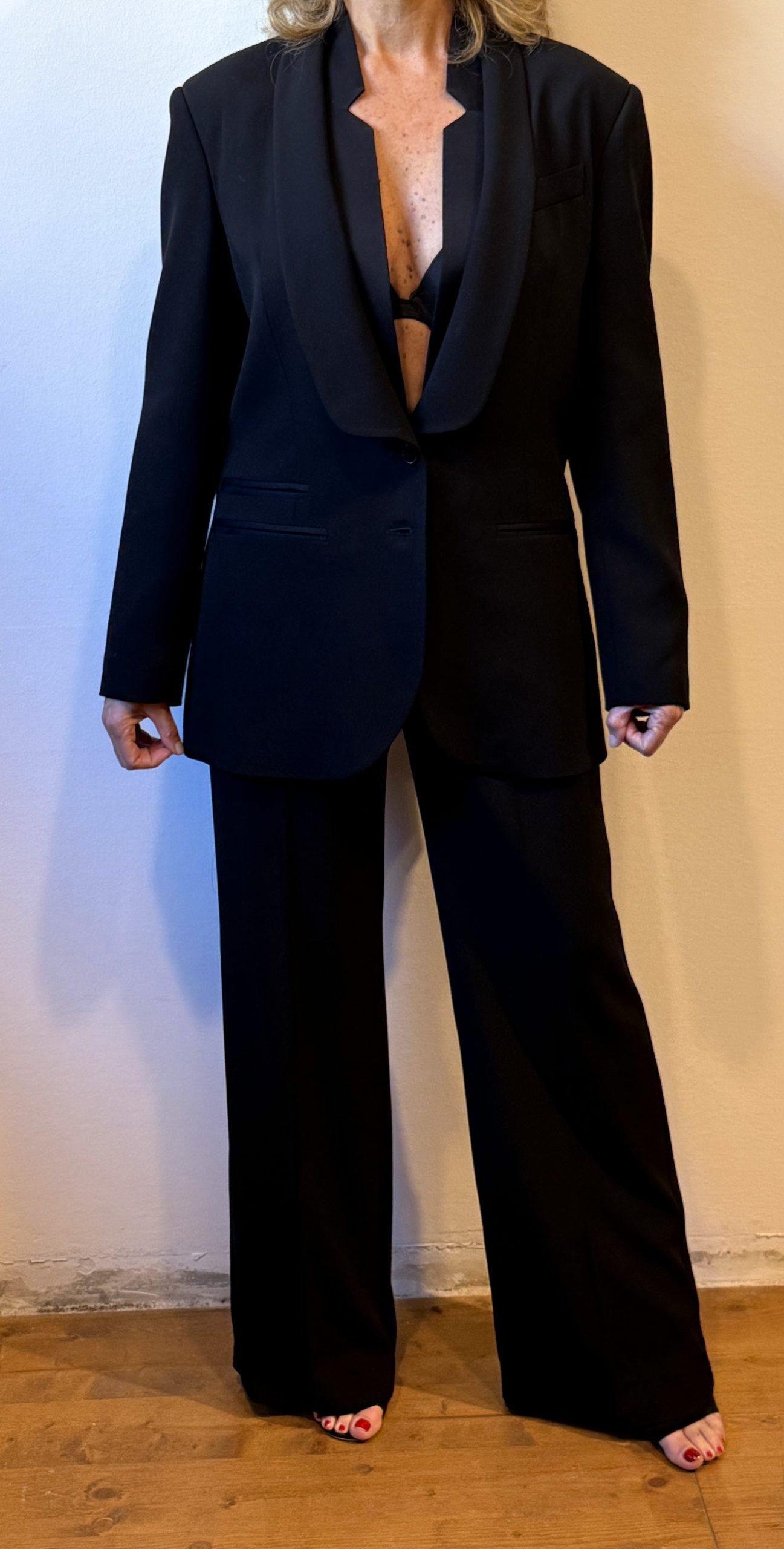 Bellissima questa giacca modello smoking fluida in satin misto lana, con doppio risvolto. Puoi coordinarla col pantalone nello stesso tessuto con dettaglio alla tasca in satin.