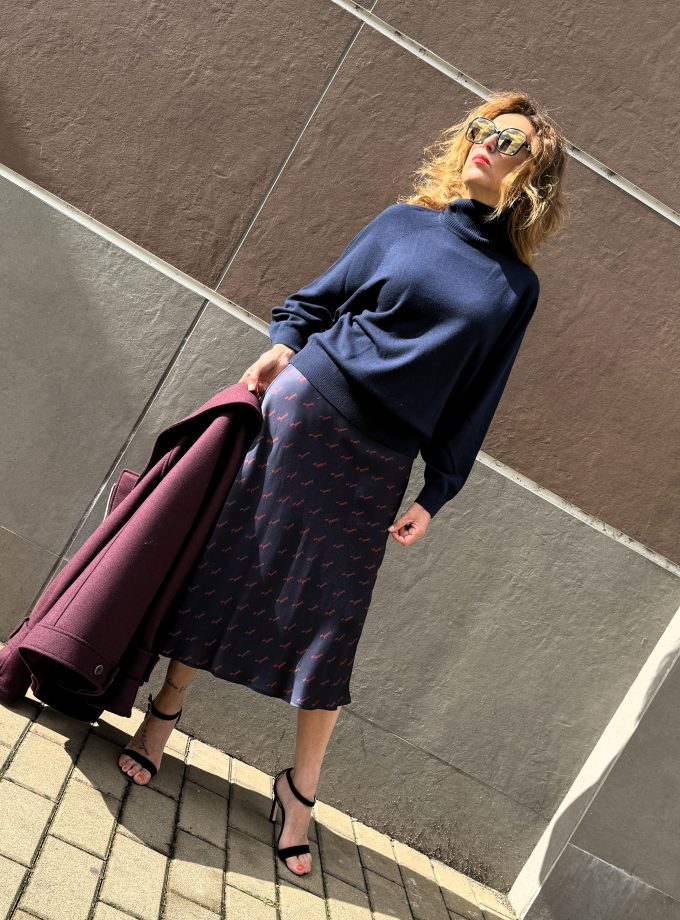 Minimalismo e silhouette avvolgente si incontrano in questa gonna midi firmata Manila Grace. Il design tubolare con vita alta valorizza la figura in modo sofisticato. Dettaglio cinturino e passanti alla vita, spacco profondo sul dietro.