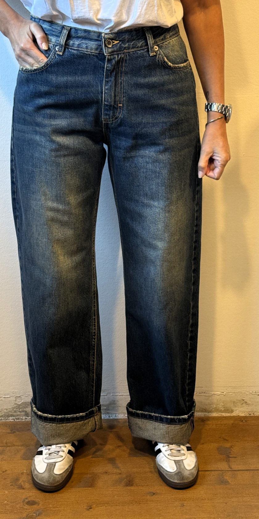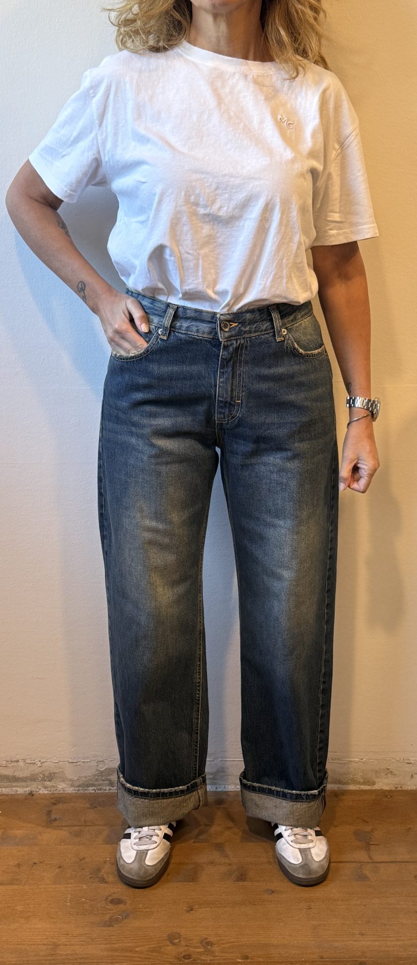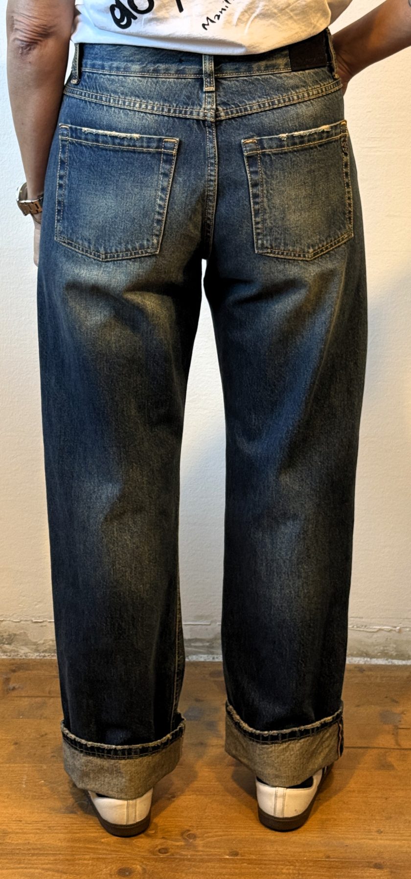 Jeans modello 5 tasche lavaggio medio scuro con rifiniture usurate e tocco vintage .Made in Italy. Materiale : 100 % Cotone . Colore : Variante Unica