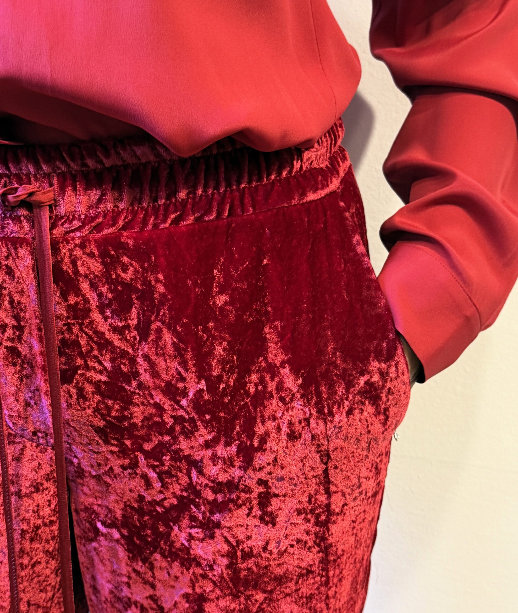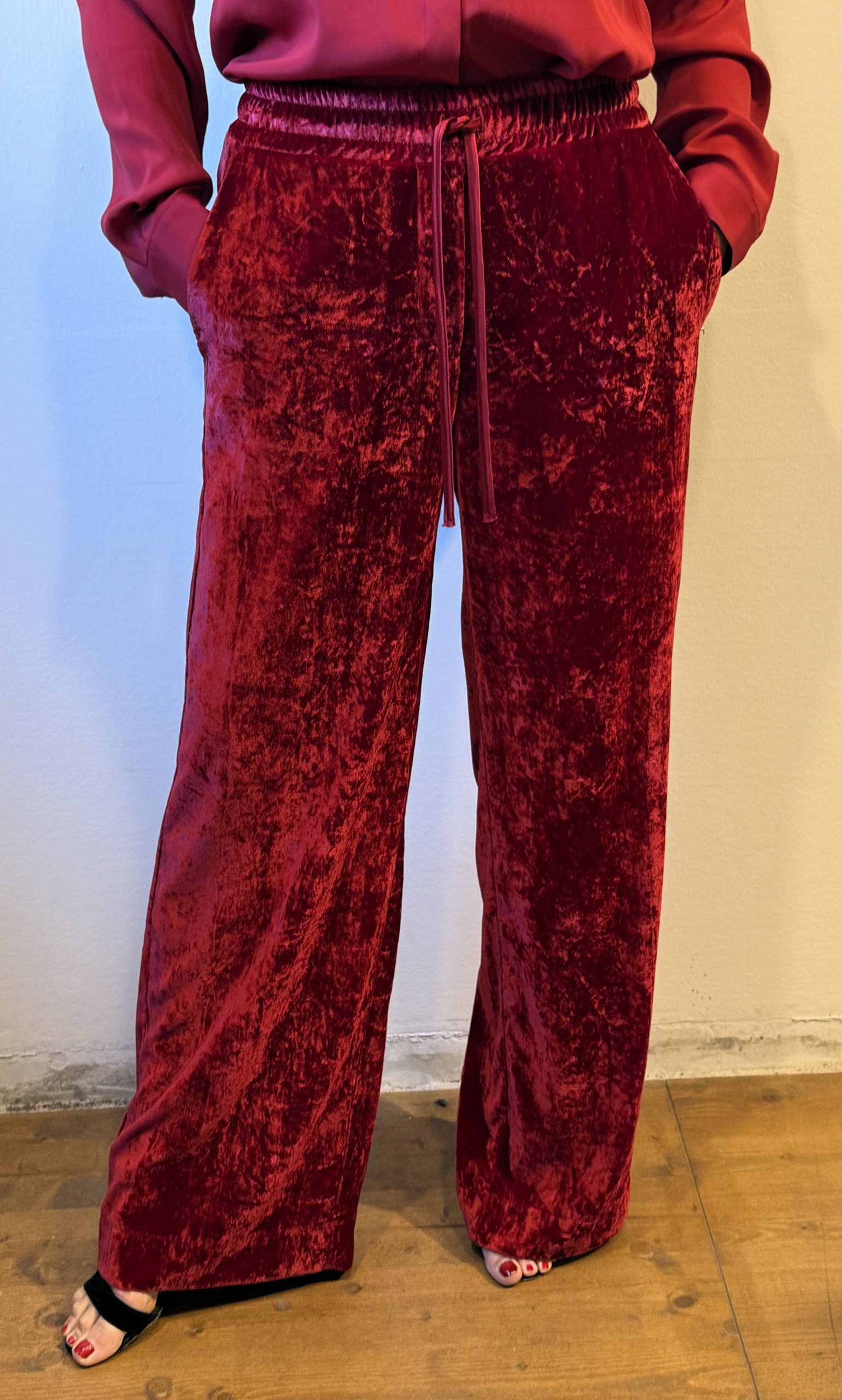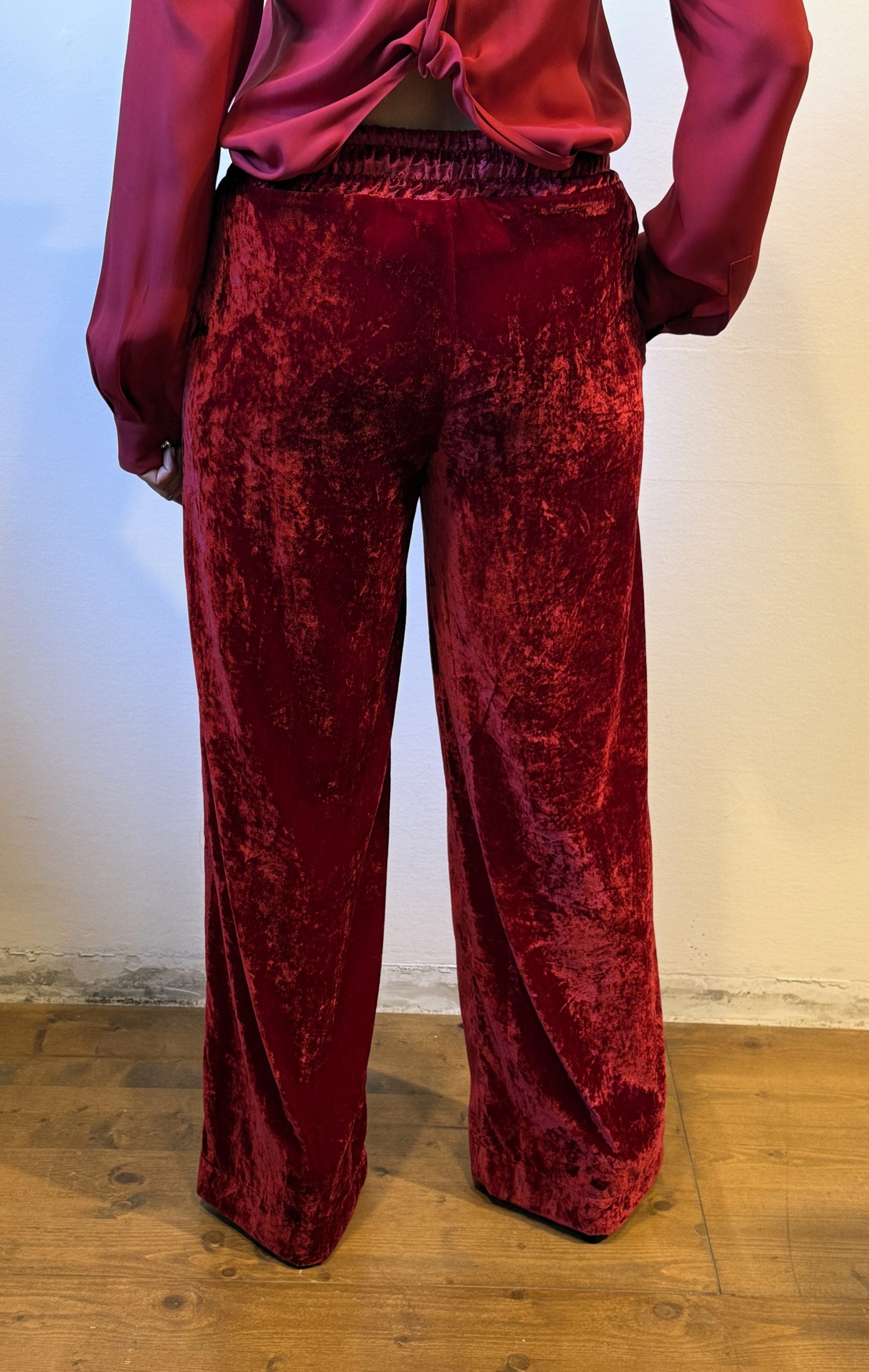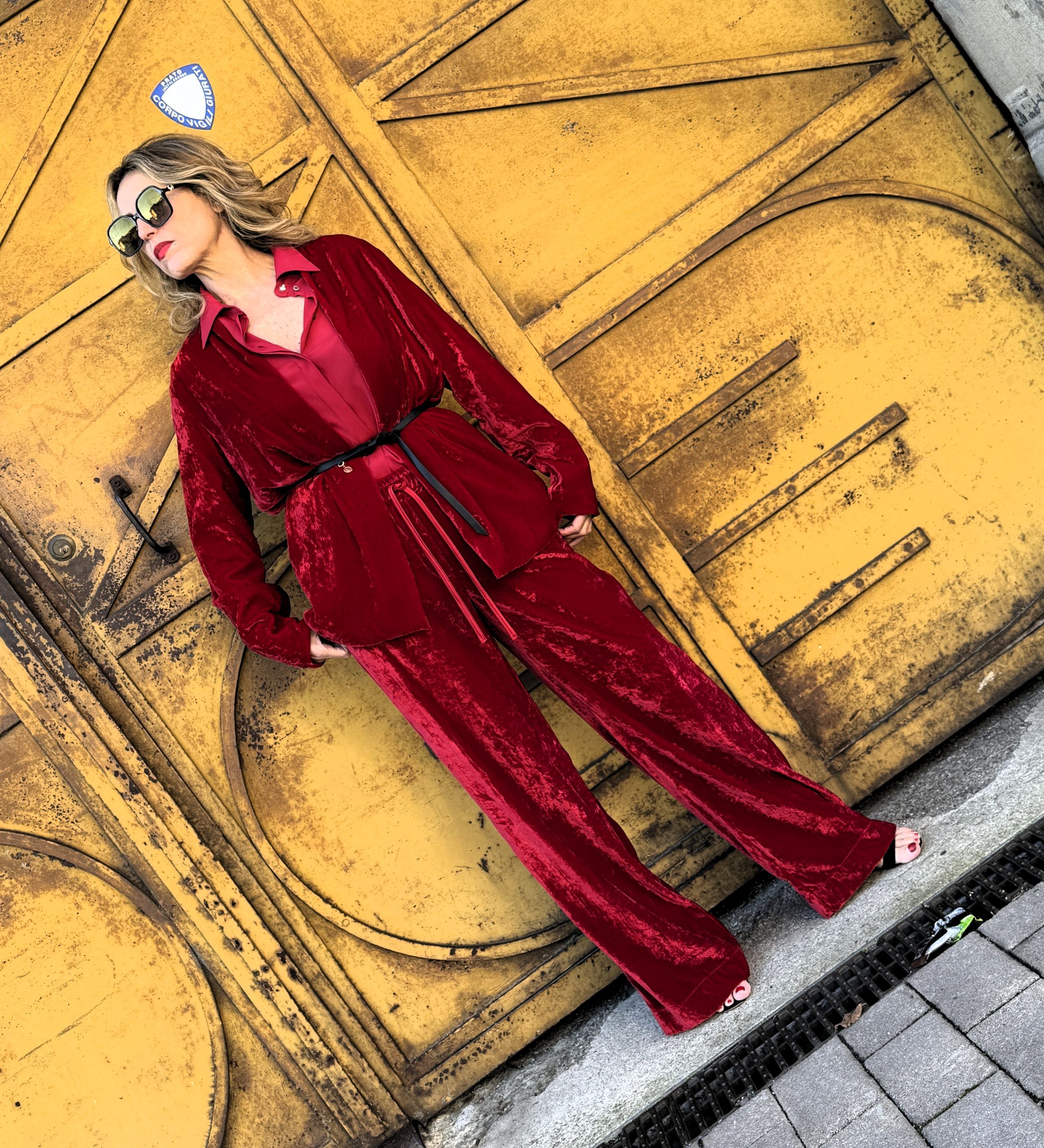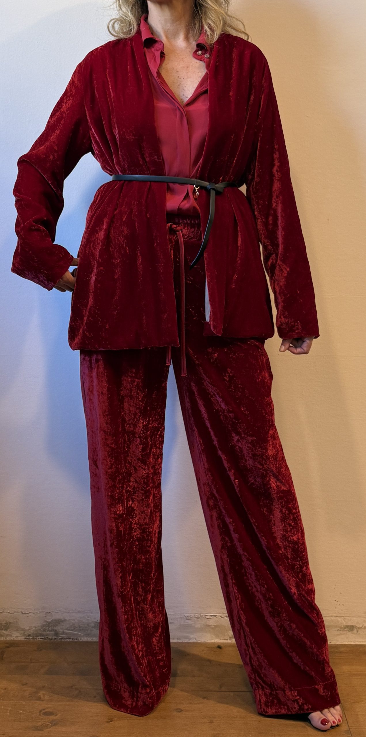 Pantalone palazzo fluido in velluto misto seta, effetto satinato con elastico e coulisse in vita . Puoi coordinarla con la giacca destrutturata nello stesso tessuto. Materiale : 80 % Rayon 20 % Seta. Colore : Cherry.