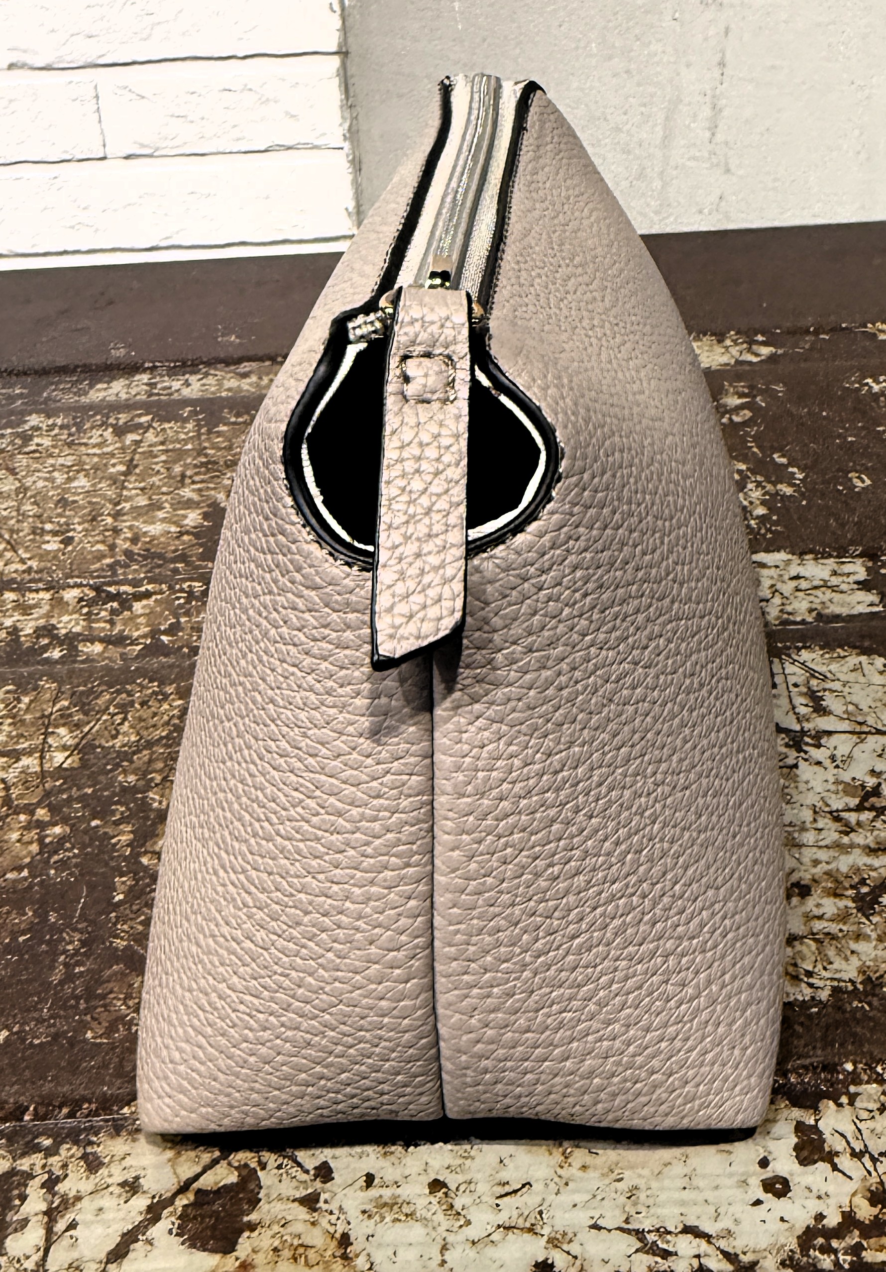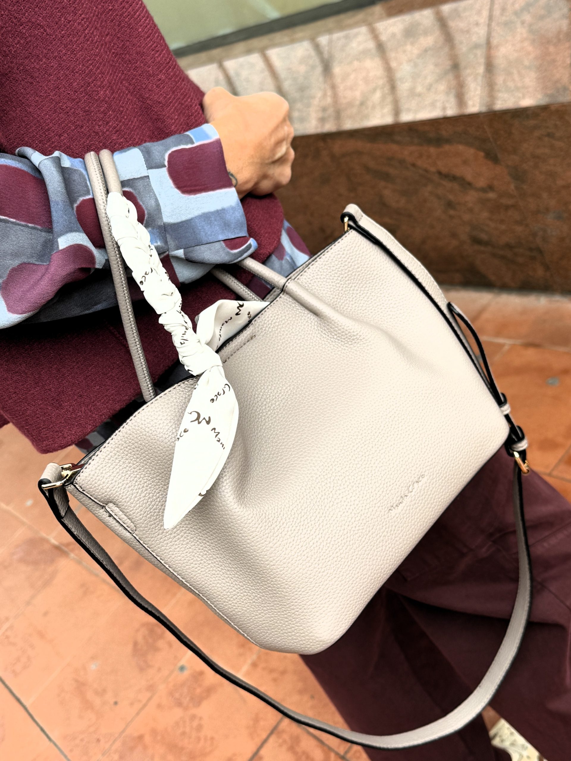 Compatta ma di grande impatto, questa mini shopper coniuga praticità e stile in un accessorio versatile e femminile. Realizzata in similpelle effetto martellato, si distingue per il manico con foulard annodato, Ideale per l’uso quotidiano o per completare con eleganza i look più essenziali. Non di poco rilievo la pochette interna capientissima con zip.