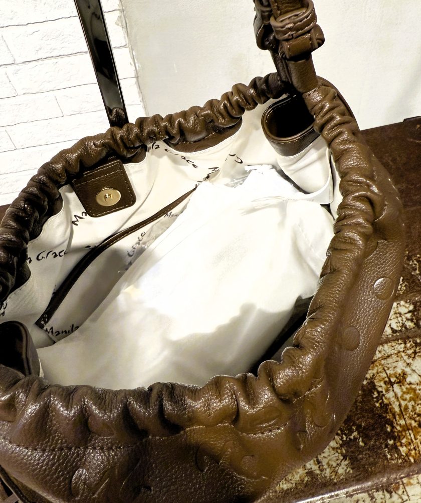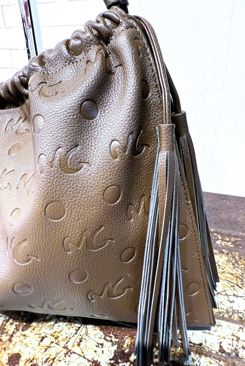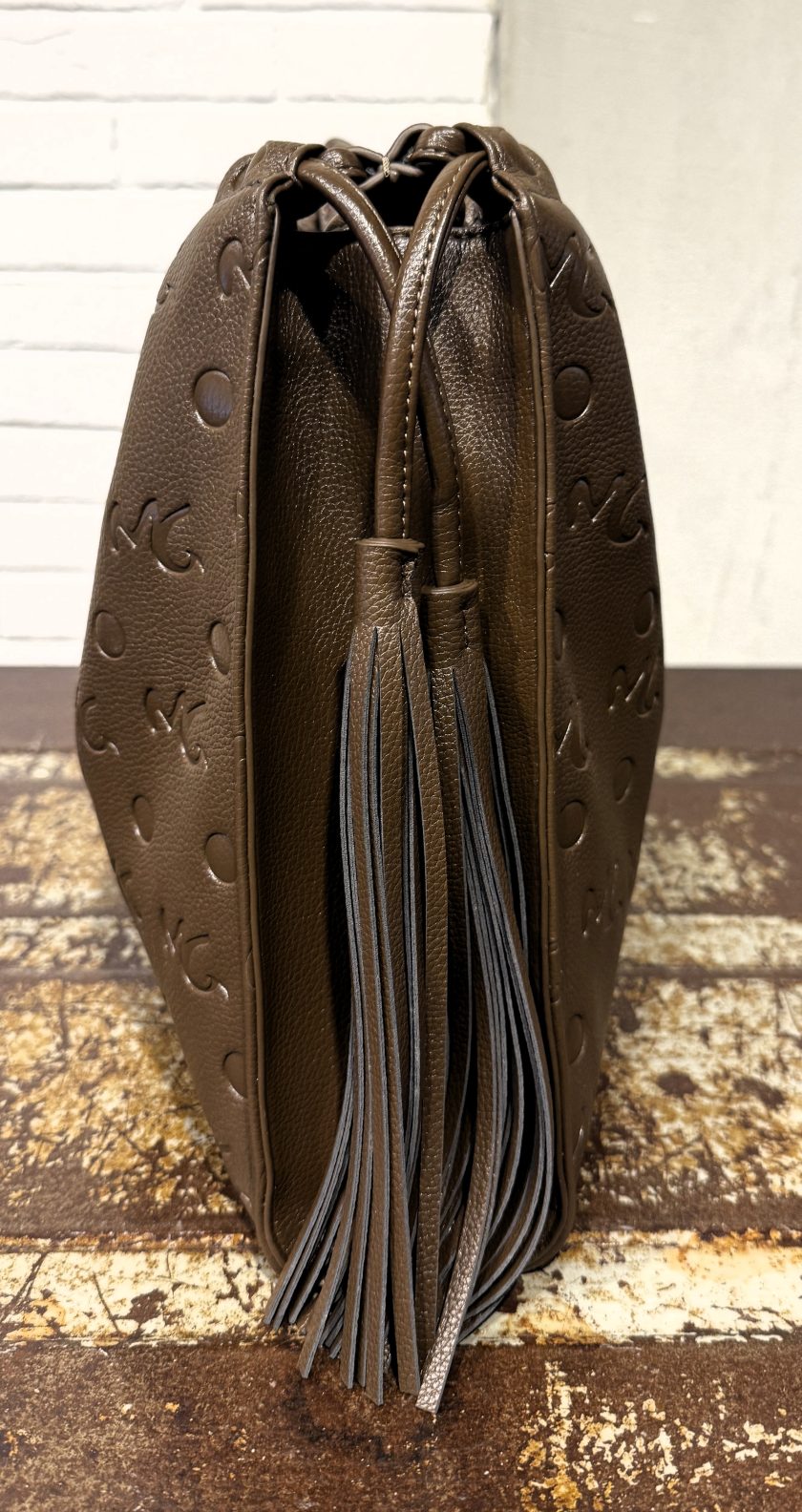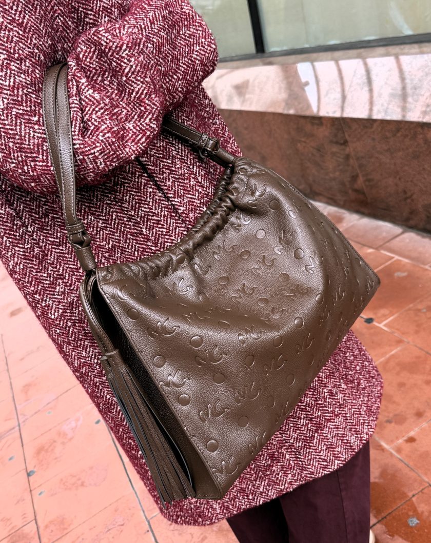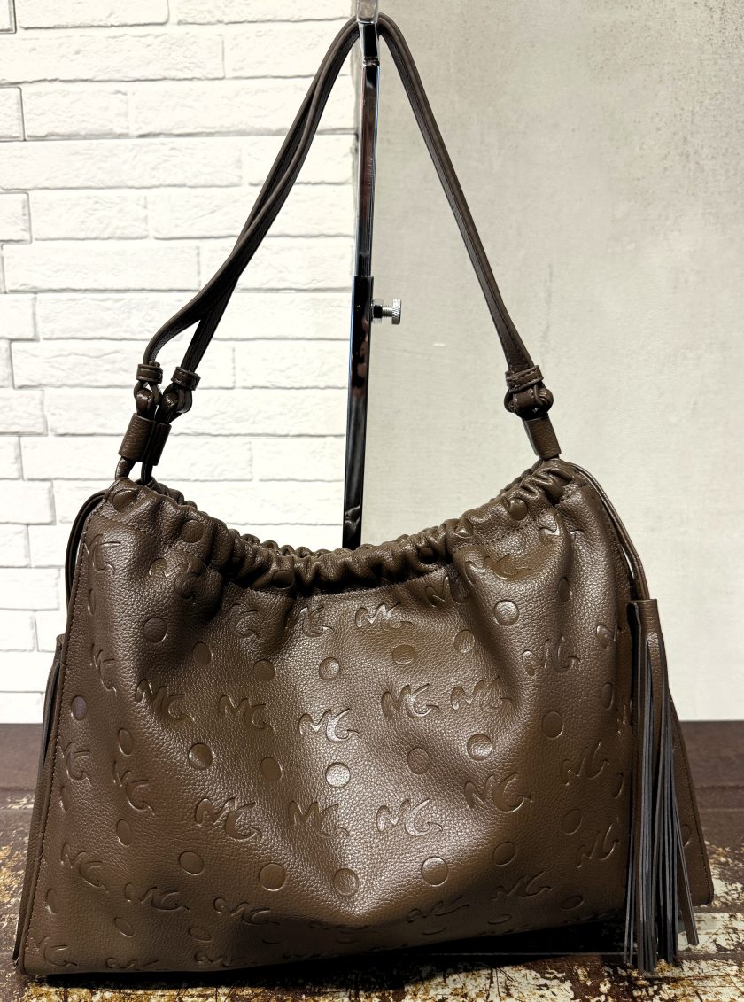 Un modello grintoso ma elegante, questa borsa a spalla si distingue per la texture con logo MG goffrato e i lunghi dettagli con frange laterali. Il design morbido con chiusura a coulisse la rende perfetta per un uso quotidiano ma ricercato.
