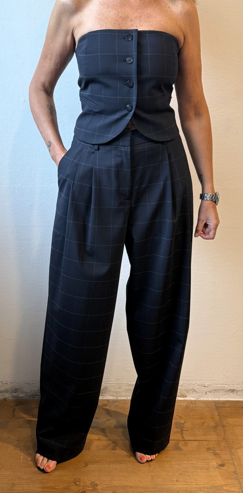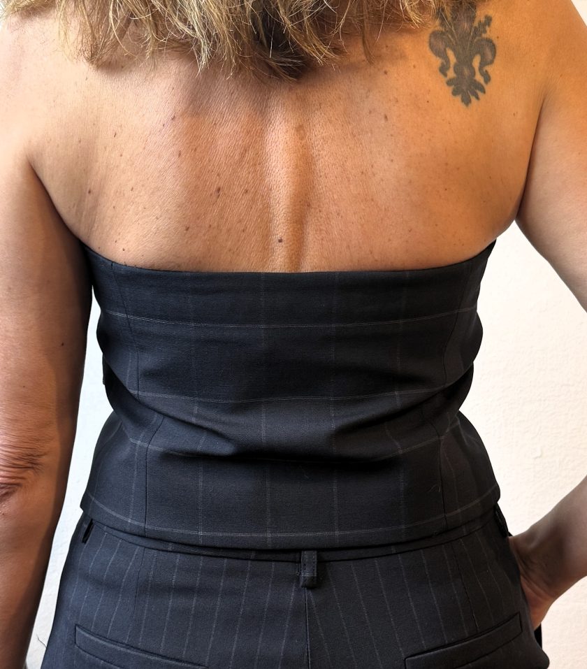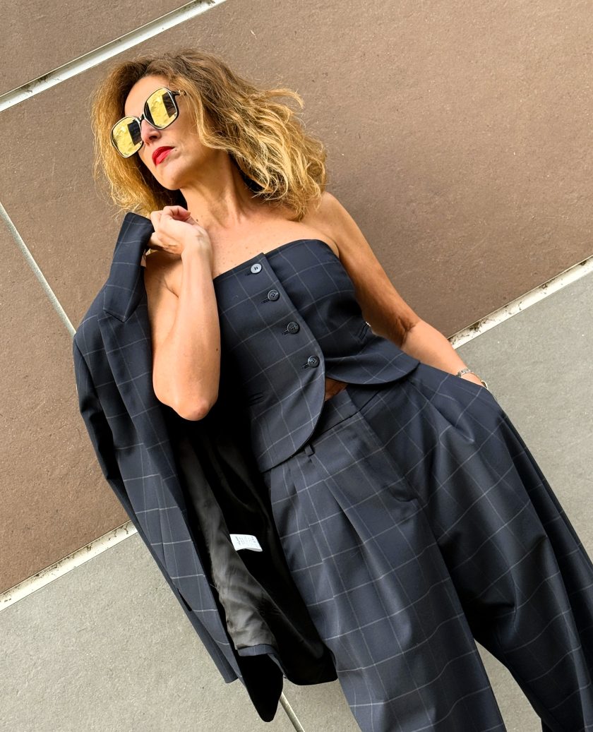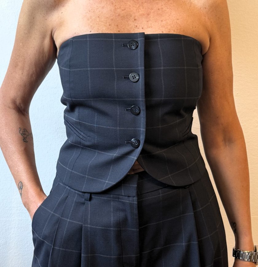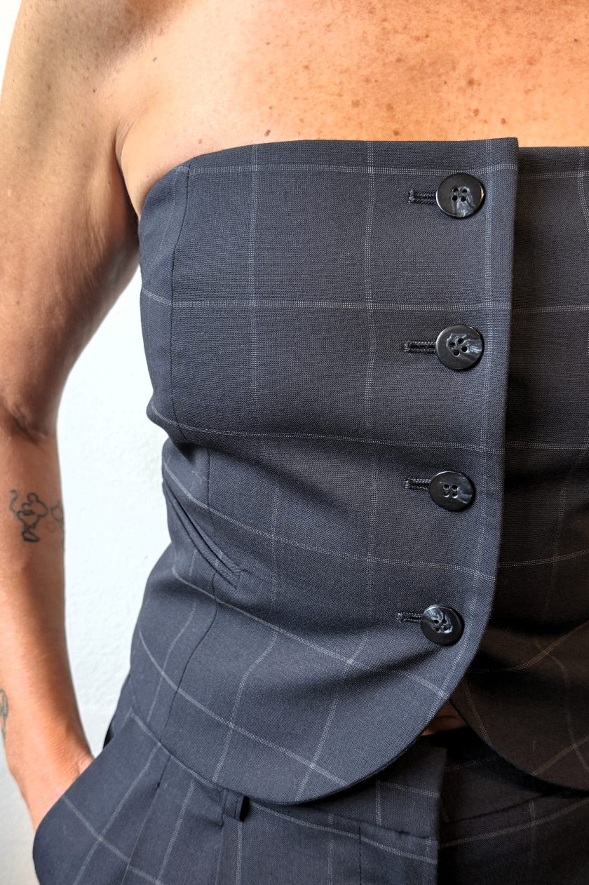 Top bustier patchwork check in misto lana con bottoni. Puoi portarlo da solo o fargli fare la funzione di gilet indossandolo con una camicia sotto. Puoi coordinarlo col pantalone la gonna e la giacca nello stesso tessuto. Un insieme favoloso.