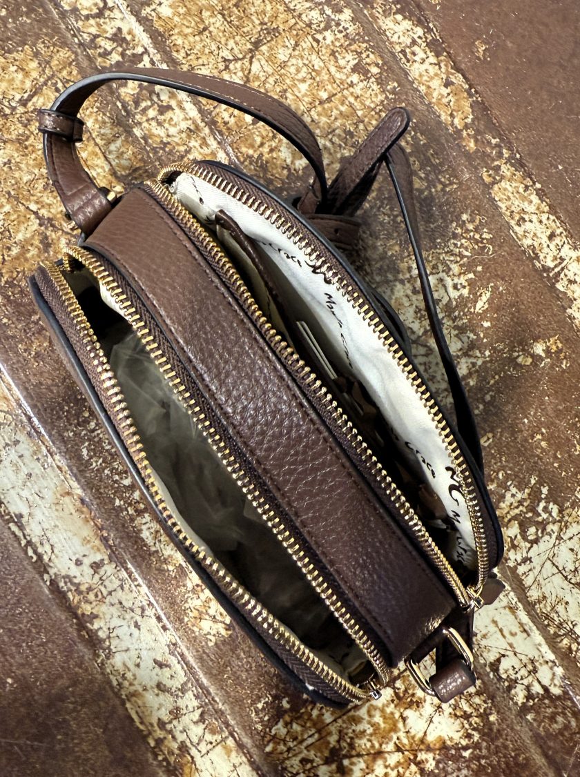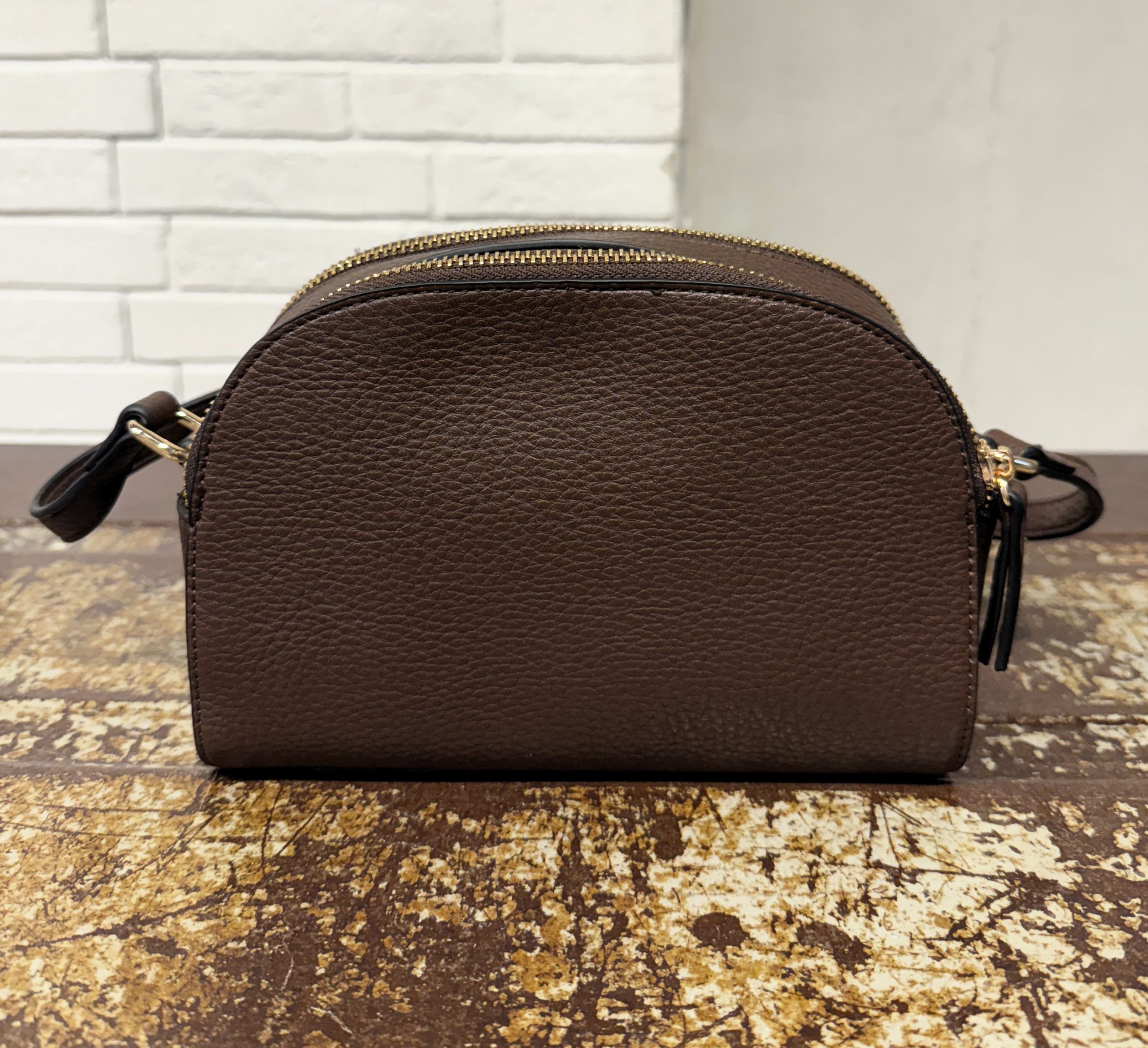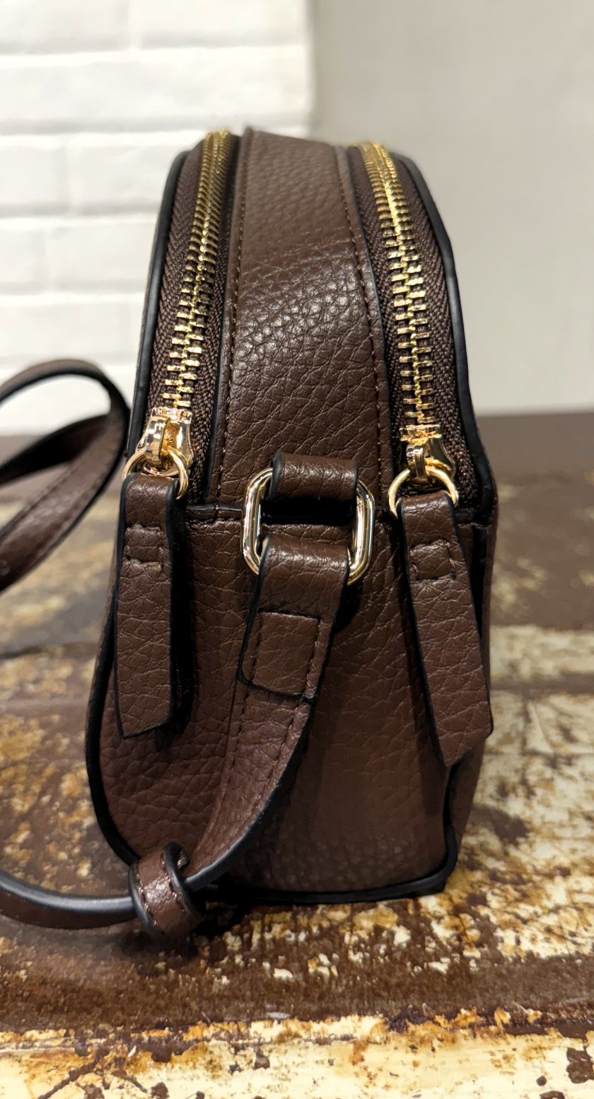 Misure contenute, ma ugualmente molto capiente la tracollina in ecopelle martellata logo Mg sul davanti doppia zip taschina interna tracolla regolabile e rifiniture dorate.